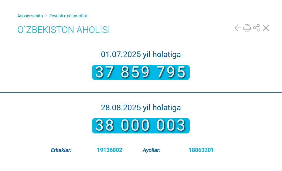 По состоянию на 28 августа, постоянное население Узбекистана превысило 38 миллионов человек. Об этом свидетельствуют данные, опубликованные на официальном сайте Национального комитета по статистике.