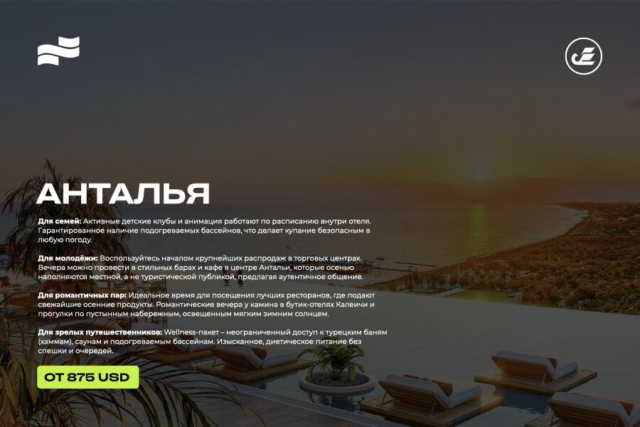 Анталья в конце осени — это лучшее соотношение цены и качества для тех, кто ищет роскошь без переплат и полноценное восстановление. С началом низкого сезона лучшие 5-звёздочные отели не закрываются — они предлагают высочайший сервис, изысканное питание и доступ к премиальному wellness-отдыху, но по минимальным ценам.