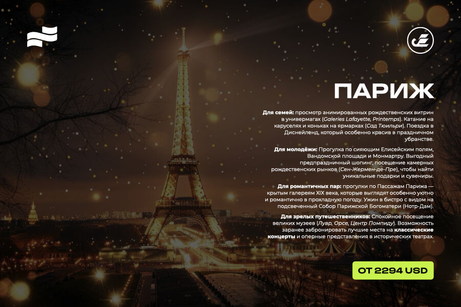 Для молодёжи: прогулка по сияющим Елисейским полям, Вандомской площади и Монмартру. Выгодный предпраздничный шопинг, посещение камерных рождественских рынков (Сен-Жермен-де-Пре), чтобы найти уникальные подарки и сувениры.