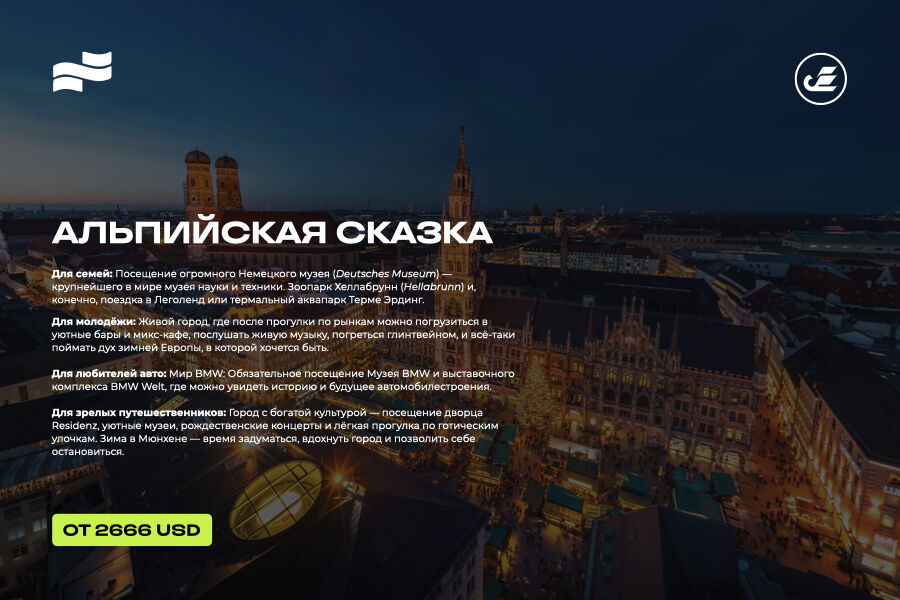 Для зрелых путешественников: город с богатой культурой — посещение дворца Residenz, камерные музеи, рождественские концерты и прогулки по готическим улочкам. Зима в Мюнхене — время вдохнуть город и позволить себе остановиться.