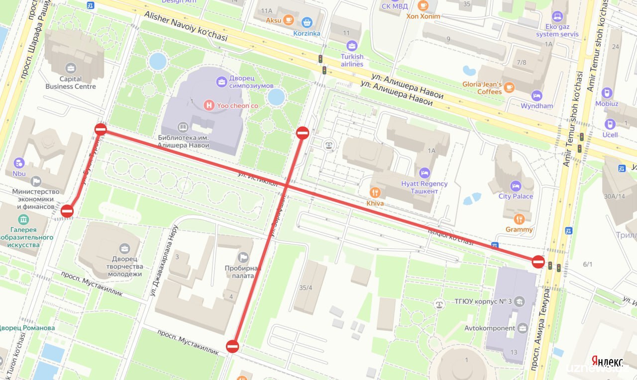 — участок улицы Зарафшан между контрольно-пропускным пунктом гостиницы Hyatt Regency Tashkent и улицей Матбуотчилар;