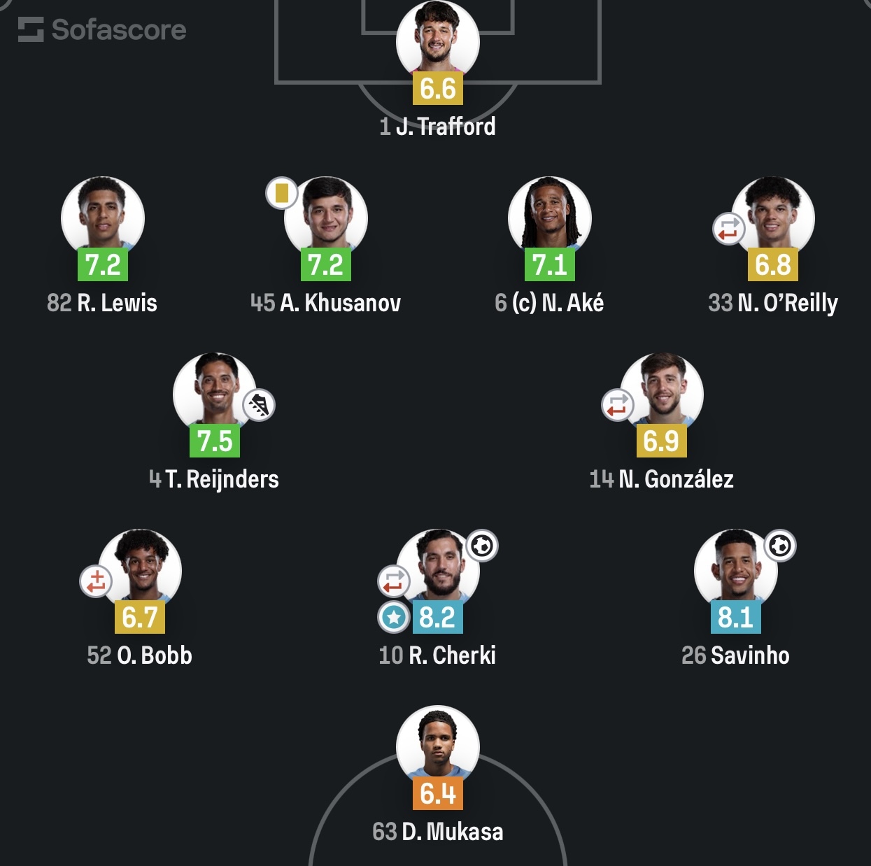 Абдукодир Хусанов вышел в стартовом составе «горожан» и провёл на поле весь матч, надёжно действуя в обороне. По итогам встречи аналитический портал SofaScore оценил игру узбекистанского защитника в 7,2 балла.