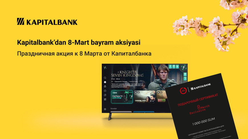 Для участия в акции в период с 27 февраля по 4 марта 2026 года (включительно) необходимо пополнить карту VISA или Mastercard АКБ «Капиталбанк» через банкомат банка по номеру мобильного телефона на сумму от 1 250 000 сумов (эквивалент 100 USD).