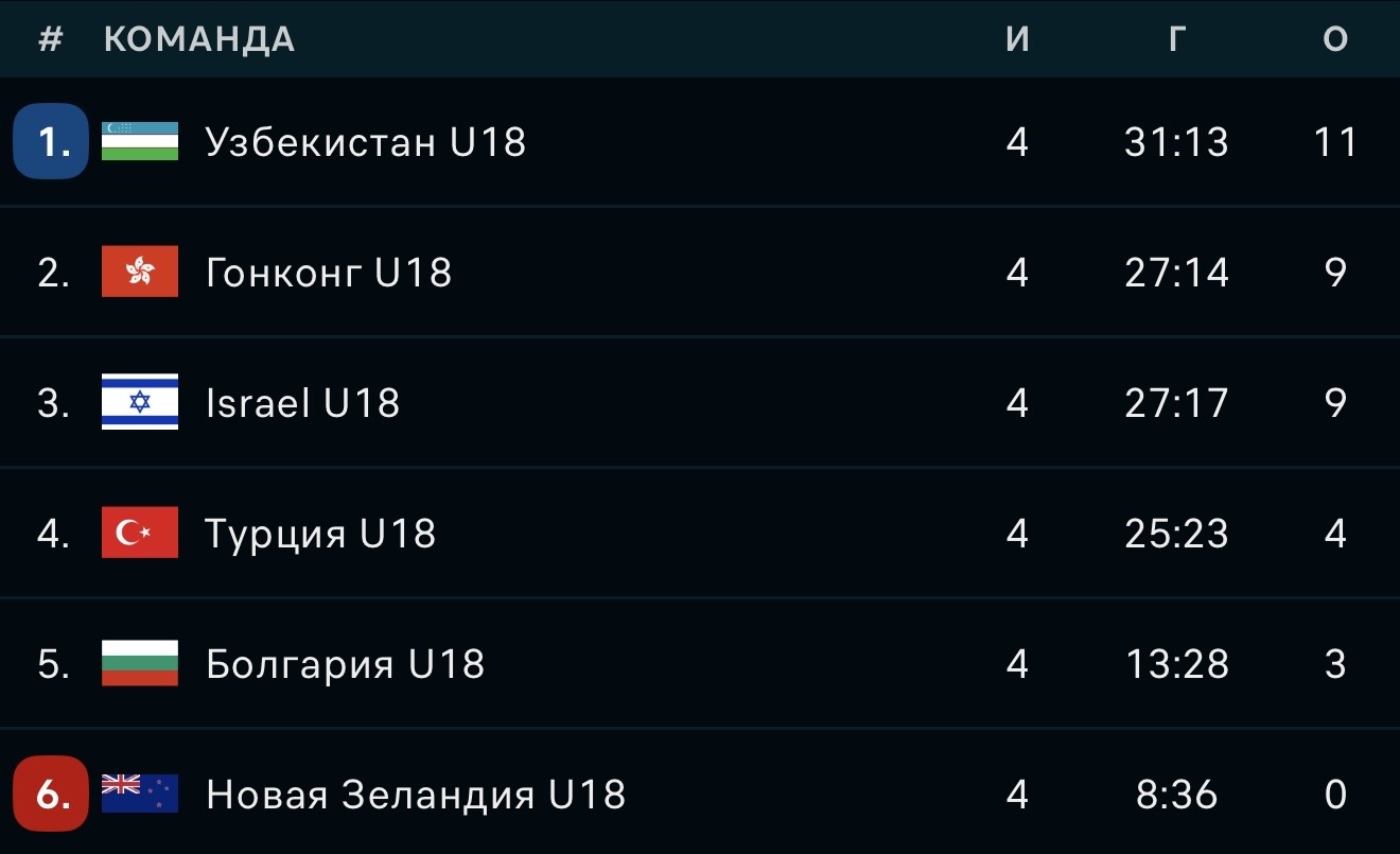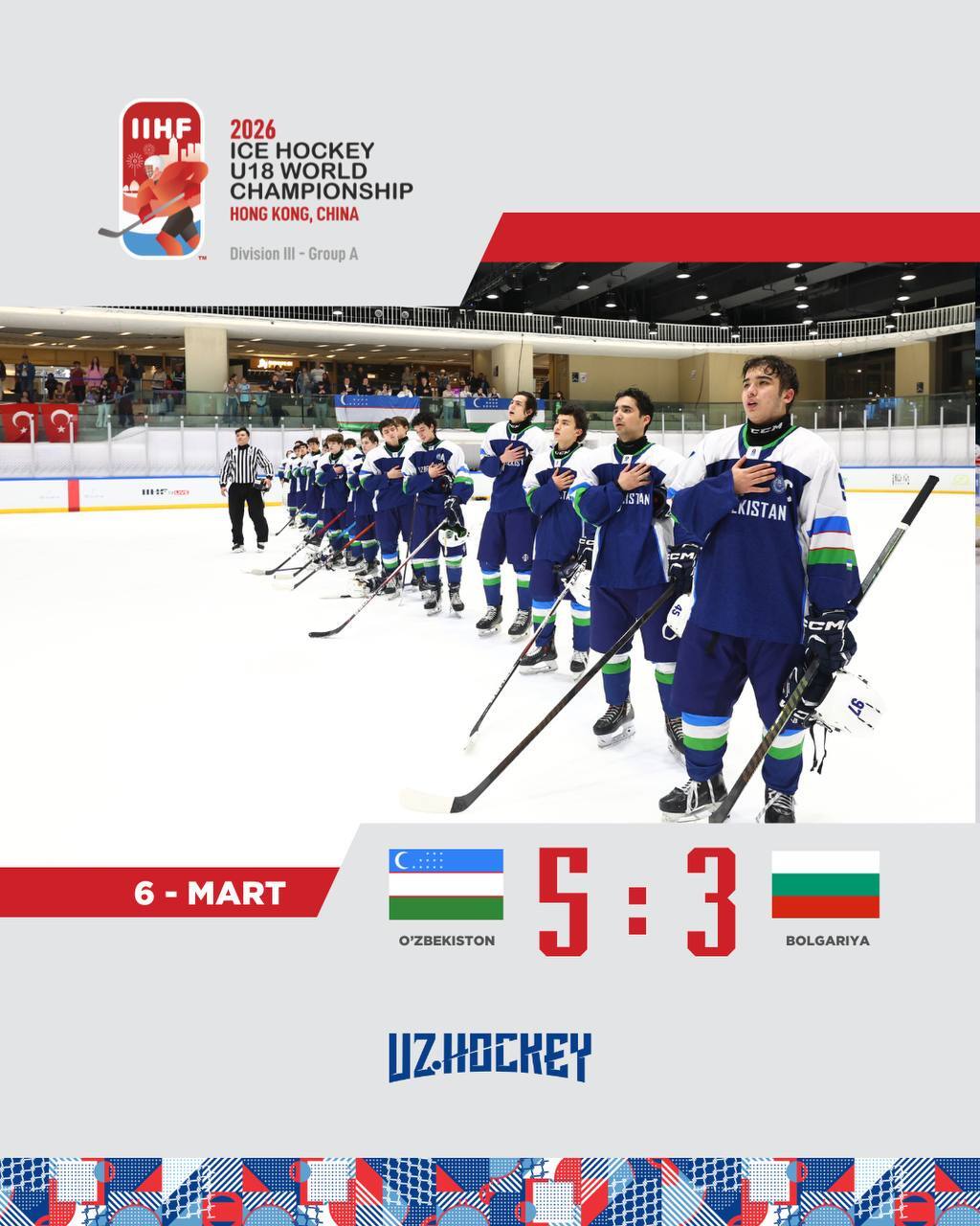 В матче 4-го тура узбекские хоккеисты обыграли сборную Болгарии со счётом 5:3. Благодаря этой победе команда набрала 11 очков и продолжает занимать первое место в турнирной таблице.