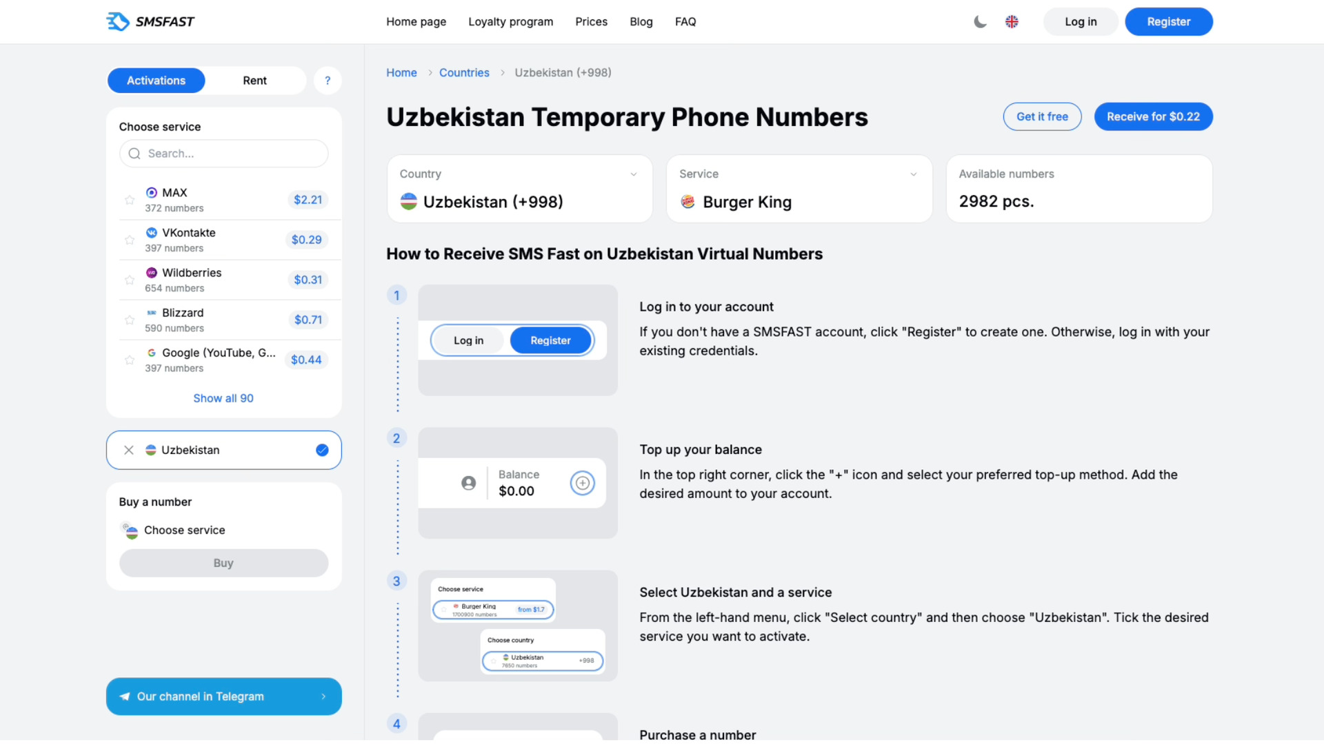 В Минцифры сообщили, что в онлайн-сервисе smsfast.com наряду с узбекскими номерами есть виртуальные номера многих стран, включая США, Канаду, Великобританию, ОАЭ, Португалию, Вьетнам и другие.
