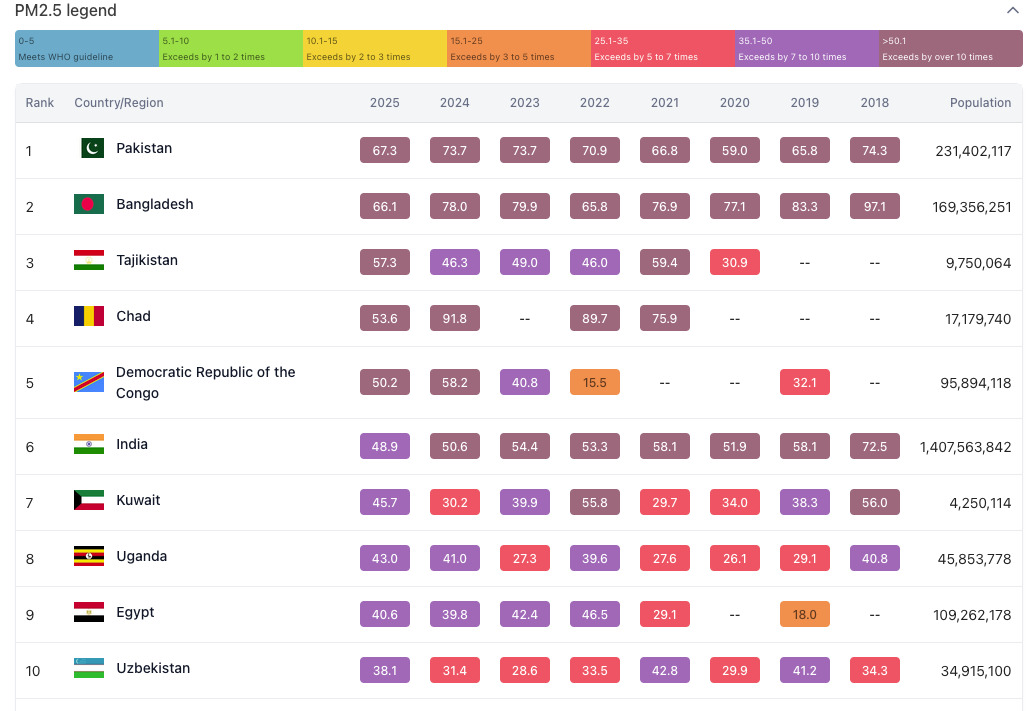• Самыми загрязнёнными странами стали: Пакистан (67,3 мкг/куб. м), Бангладеш (66,1), Таджикистан (57,3), Чад (53,6) и Демократическая Республика Конго (50,2).
