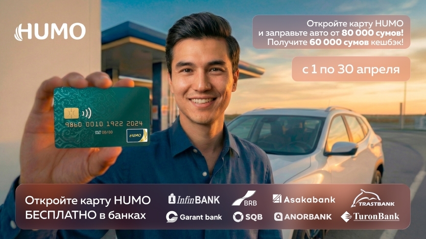 С 1 по 30 апреля 2026 года пользователи, оформившие физическую или виртуальную карту HUMO в банках-партнёрах, смогут получить кешбэк за оплату топлива.