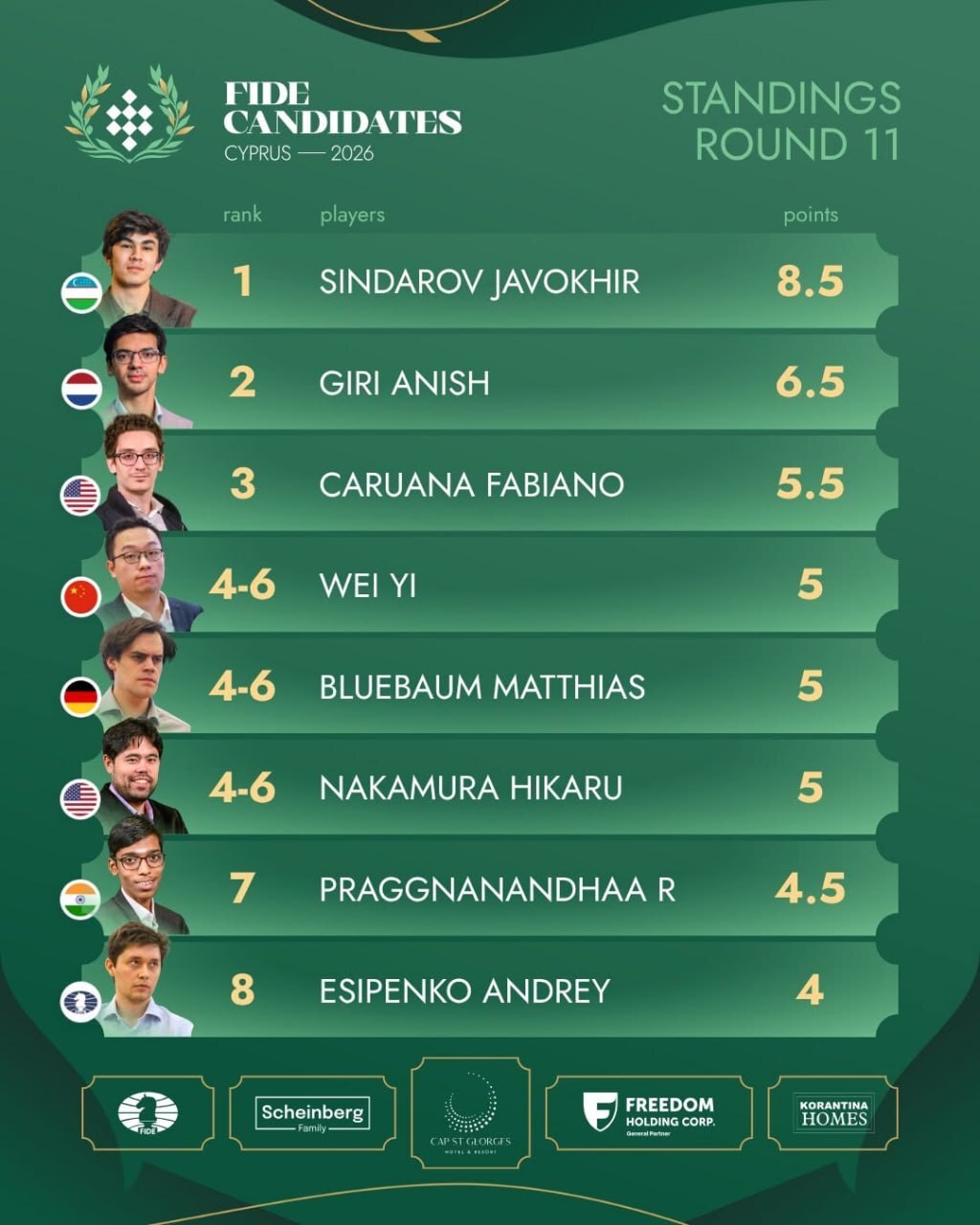 После 11 туров Синдаров набрал 8,5 очка и сохраняет единоличное лидерство в турнирной таблице. Его ближайший преследователь Аниш Гири отстаёт на два очка, Фабиано Каруана занимает третье место.