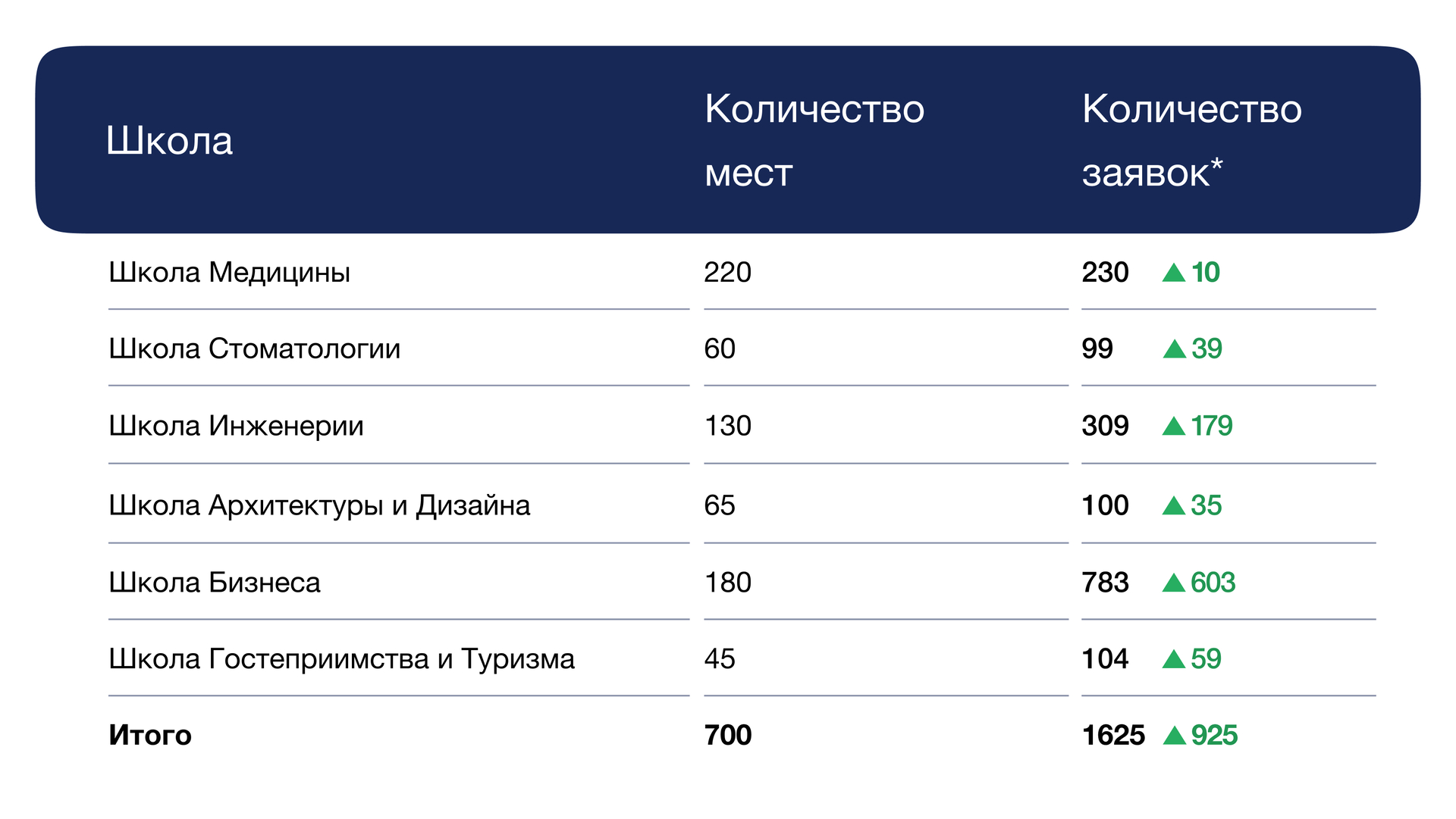 Для удобства абитуриентов на сайте университета размещена таблица с актуальным количеством кандидатов на место по каждой школе. Она обновляется в режиме реального времени и позволяет отслеживать конкурсную ситуацию по мере развития приёма.
