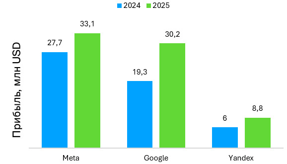 Оценить точный объём digital-рынка всё ещё проблематично из-за отсутствия единого измерителя. Однако показательными служат данные Государственного налогового комитета (ГНК): совокупная прибыль иностранных компаний, выступающих основными селлерами цифровой рекламы, выросла на 35%: