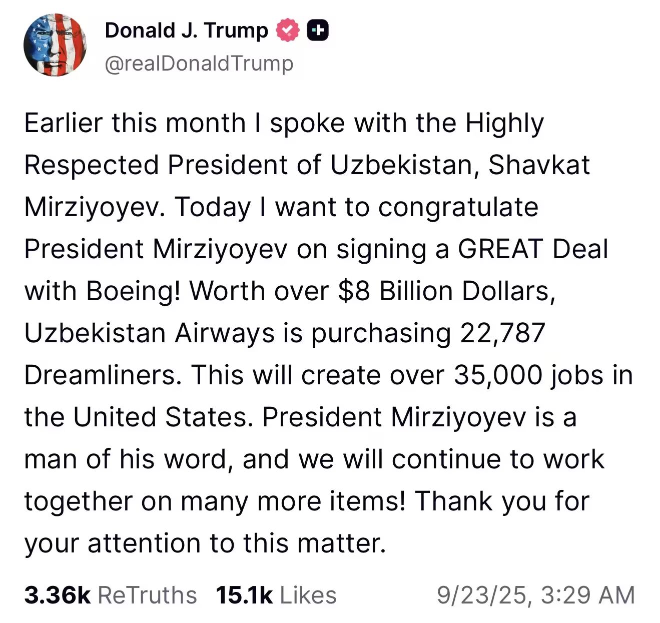 АҚШ президенти Дональд Трампнинг Truth ижтимоий тармоғида таъкидлашича, ушбу шартнома қиймати 8 миллиард долларни ташкил этади. Бу АҚШда 35 мингдан ортиқ иш ўрни яратади. Трампнинг сўзларига кўра, Шавкат Мирзиёев бир сўзли инсон ва ҳамкорлик кўплаб йўналишларда давом этади.